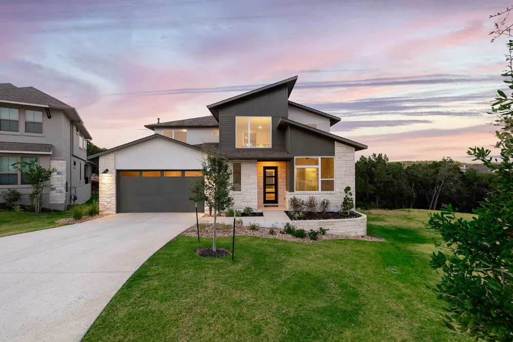 Discover luxury living in this stunning contemporary home nestled in The Hollows Community of Lago Vista. This meticulously crafted residence spans 3,648 square feet, offering an impeccable blend of modern design and functional elegance. The thoughtfully designed floor plan features four bedrooms and five bathrooms, creating an ideal space for both family living and entertaining. Step inside to find soaring ceilings complemented by abundant natural light flowing through expansive slider doors. The gourmet kitchen showcases double-stacked cabinets, premium finishes, and ample space for culinary creativity. A designated study provides the perfect remote work environment, while the separate game room and media room offer endless entertainment possibilities. The primary bedroom suite serves as a private retreat, featuring luxurious amenities and sophisticated design elements. Modern stair railings and ambient lighting fixtures throughout add contemporary flair to the home's architectural appeal. The property's elevated position captures breathtaking wooded views, best enjoyed from the thoughtfully designed balcony patio. Outdoor living reaches new heights with an extended patio, perfect for al fresco dining and entertaining. The grand driveway provides a striking approach to this remarkable residence, while the surrounding mature trees create a peaceful, private setting. This home's location offers the perfect balance of tranquil seclusion and accessibility to nearby amenities. Experience the pinnacle of modern Texas Hill Country living in this exceptional property, where sophisticated design meets natural beauty in perfect harmony.