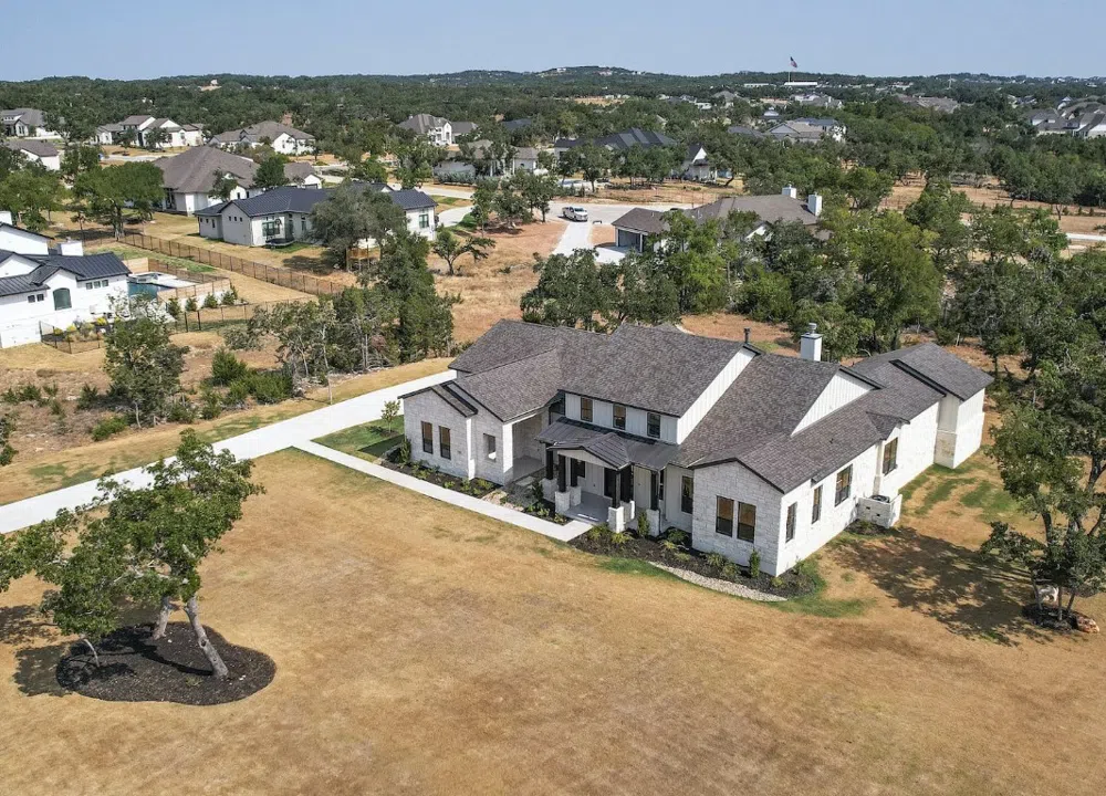 Introducing the incredible Abilene floorplan from Sitterle Homes in the prestigious Bunker Ranch community. Immerse yourself in the modern-day farmhouse aesthetic, where timeless charm meets contemporary luxury. Situated on a sprawling 1-acre lot in the sought-after Drippings Springs area, this home offers the perfect blend of tranquility and convenience. The gallery-style entrance, adorned with double iron front doors, sets the tone for the elegance that awaits you. As you enter, be captivated by the soaring 14' tall ceilings that create an atmosphere of spaciousness and grandeur. The heart of this home is the entertainer's kitchen, a culinary haven embellished with top-tier finishes and double ovens. Whether you're hosting a dinner party or preparing a family feast, this kitchen is designed to impress. With ample counter space and high-end appliances, your inner chef will be inspired to create culinary masterpieces.The main home boasts three well-appointed bedrooms, each providing a serene retreat for rest and relaxation. But that's not all – a private guest suite with its own separate entrance offers unparalleled privacy and comfort. Perfect for visiting family or friends, this guest suite ensures everyone feels welcomed and at ease.The outdoor living space is equally impressive, with a massive sliding glass door leading to the back covered patio. Step outside and be greeted by a picturesque setting featuring a tongue & groove pre-stained ceiling, a cozy fireplace, and an outdoor kitchen. Whether you're hosting a barbecue or simply enjoying a quiet evening under the stars, this patio is the perfect place to create lasting memories. Retreat to the primary bathroom and indulge in luxury. The double vanities provide ample space for morning routines, while the freestanding tub invites you to soak and unwind. The frameless glass shower adds a touch of elegance and completes the spa-like experience.